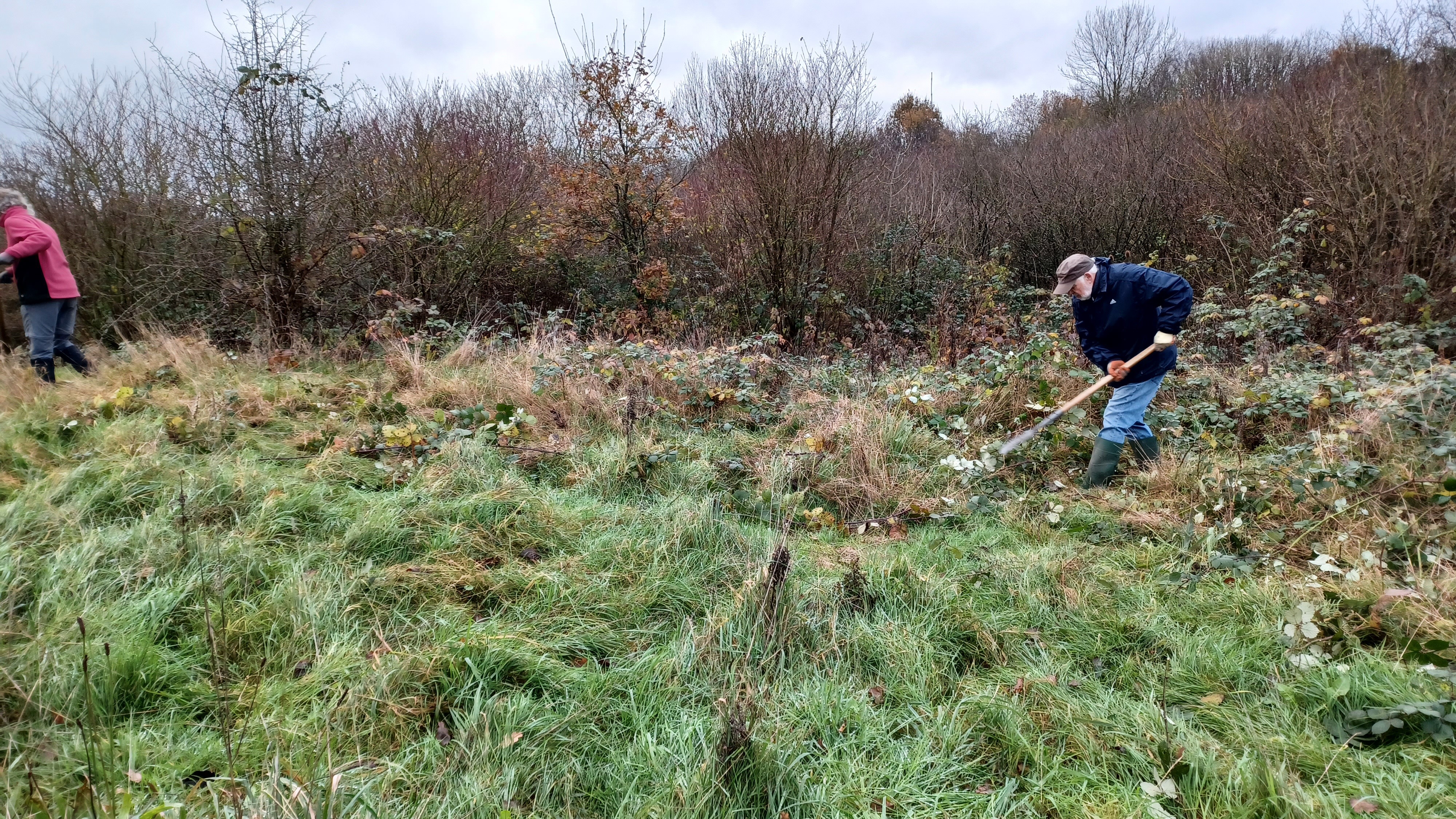 Here, Graham is using a slasher to remove some bramble. Not an easy task though because the brambles are spreading through quite long grass which was wet after a lot of earlier rain. This wet grass was tangled amongst the brambles making cutting them down difficult and hard work.